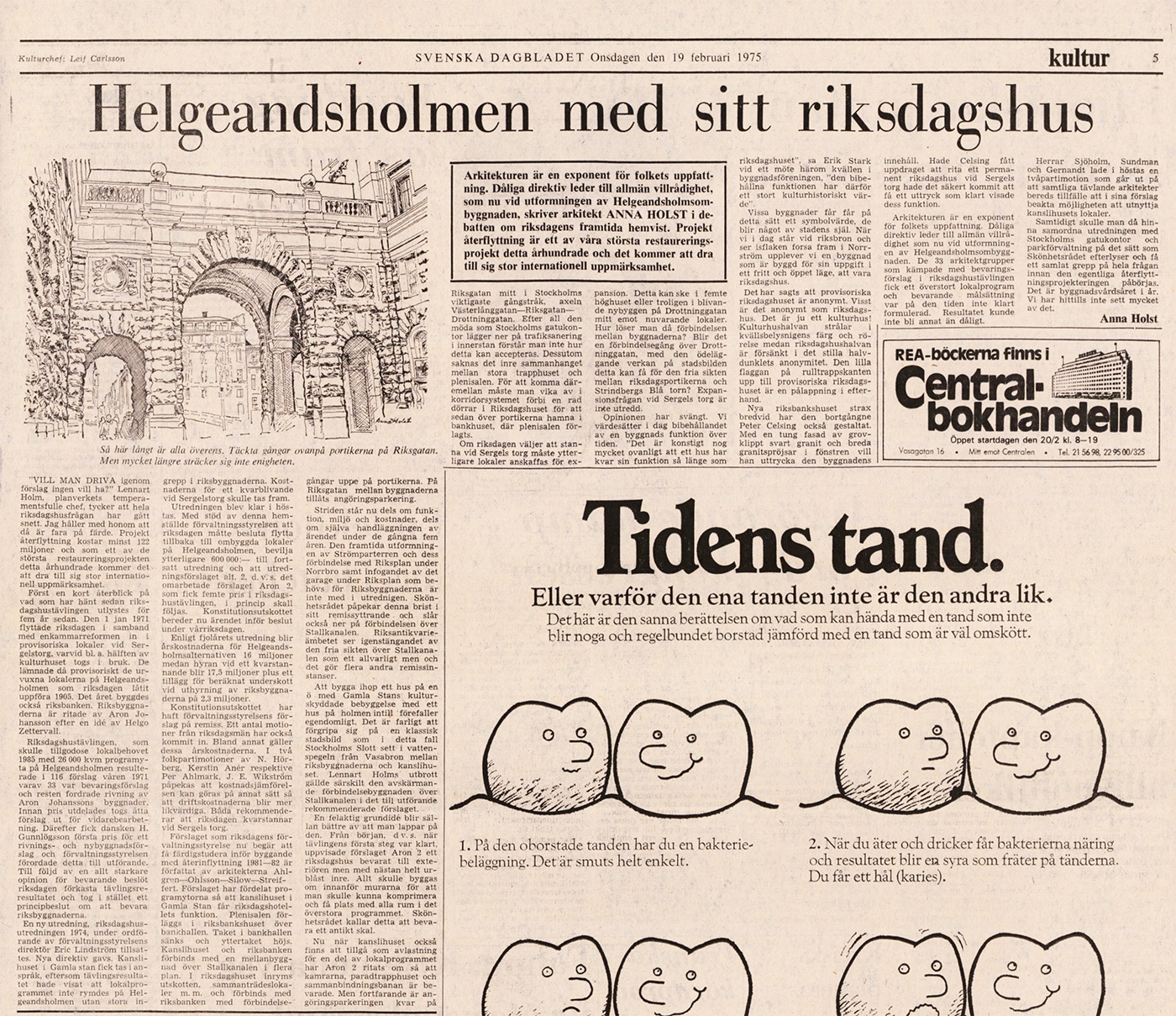 Nu vet vi att det byggdes bredvid det gamla riksdagshuset på Helgeandsholmen, men det var inte okontroversiellt. Under utgrävningarna fann man bebyggelse ända bak till 1200-talet, liksom en massa skelett. Här låg nämligen förut en kyrkogård. Totalt fick man upp sju ton med skelettdelar..!