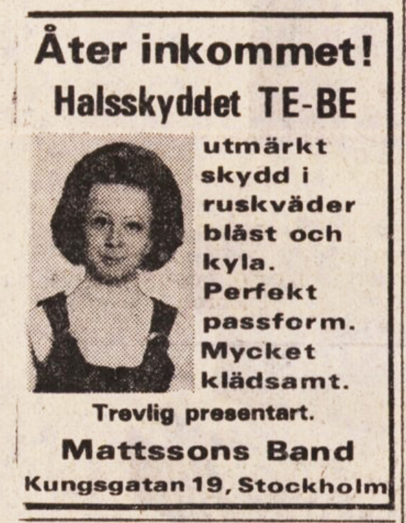 Intressant nog finns Mattssons Band fortfarande kvar och dessutom på samma gatuadress. Jag mejlade till dem för att fråga om de fortfarande säljer halsskyddet, men fick ett automatiskt meddelande om att »mottagarens inkorg är full«. Förmodligen är det fler än jag som undrar. 😜