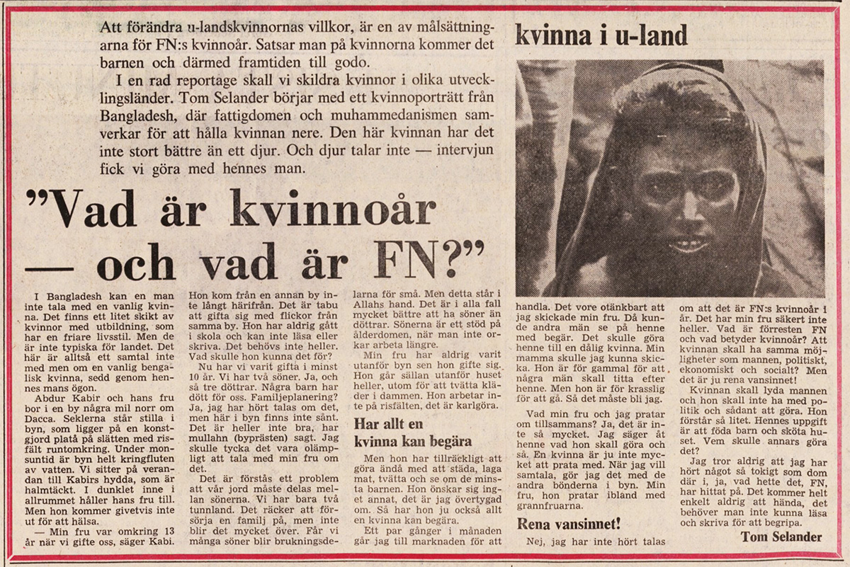 På tal om tråkiga historier… Denna dag inledde SvD en reportageserie om kvinnor i olika utvecklingsländer, och började med en kvinna i Bangladesh – som hålls nere av »fattigdom och muhammedanism [islam]«. Hennes man fick sköta snacket, för själv pratar hon inte så mycket.