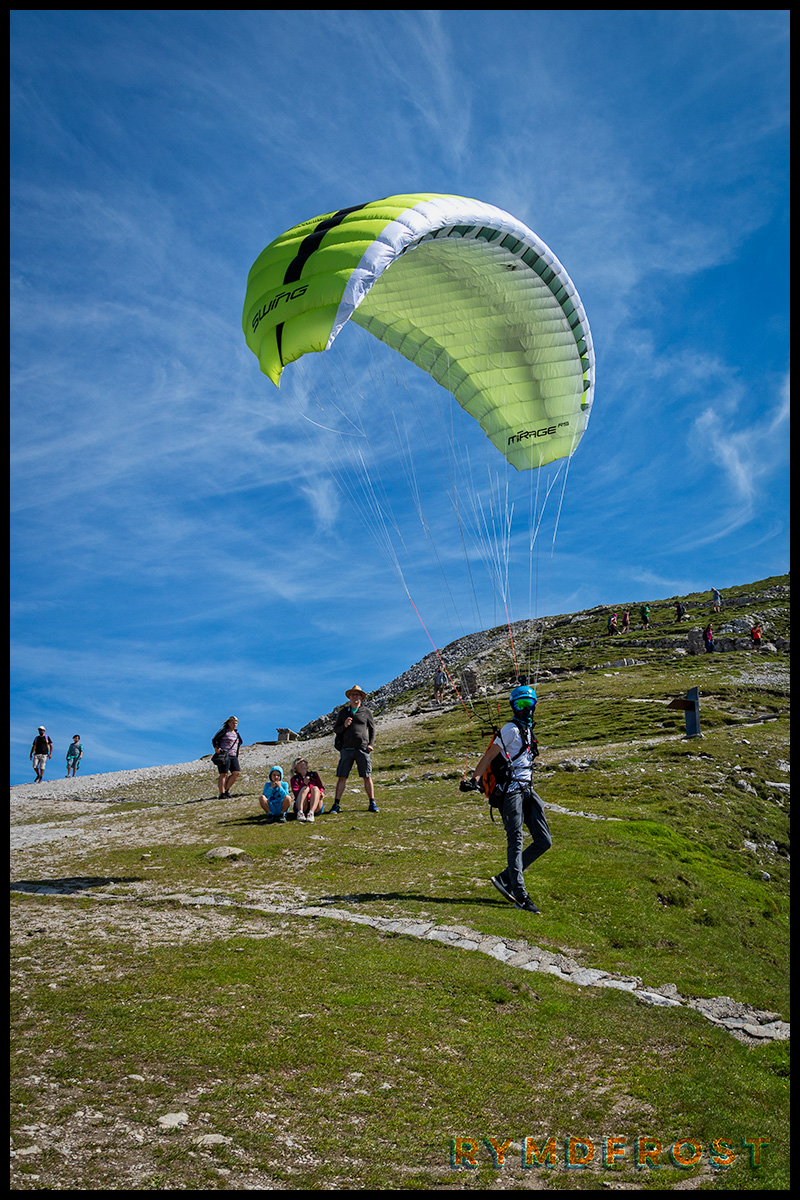 På vägen upp hade vi sällskap med några som vi antog skulle klättra eller vandra. Men vi såg snart att de vecklade ut fallskärmar. Eller glidskärmar är kanske mer korrekt. De skulle alltså glidflyga ut över dalen!