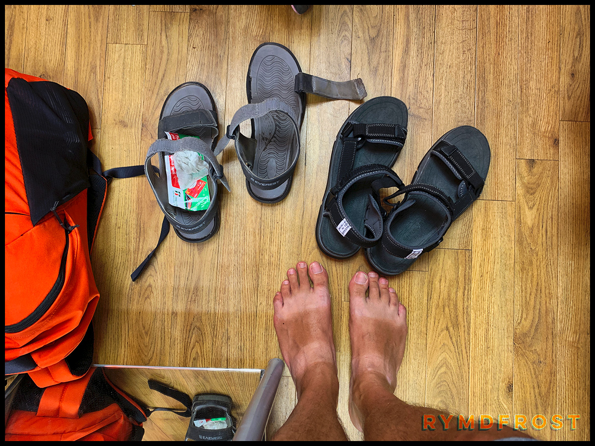 Mina sandaler har verkligen haft en tuff tid under vår resa och det har märkts att de började närma sig sig slutet för sin levnad. Tidigare på dagen hade jag fått en sten i sandalen. Och då menar jag inte en sten mellan sandalen och min fot, utan en sten mellan bottensulan och toppsulan (eller vad delarna kallas).
