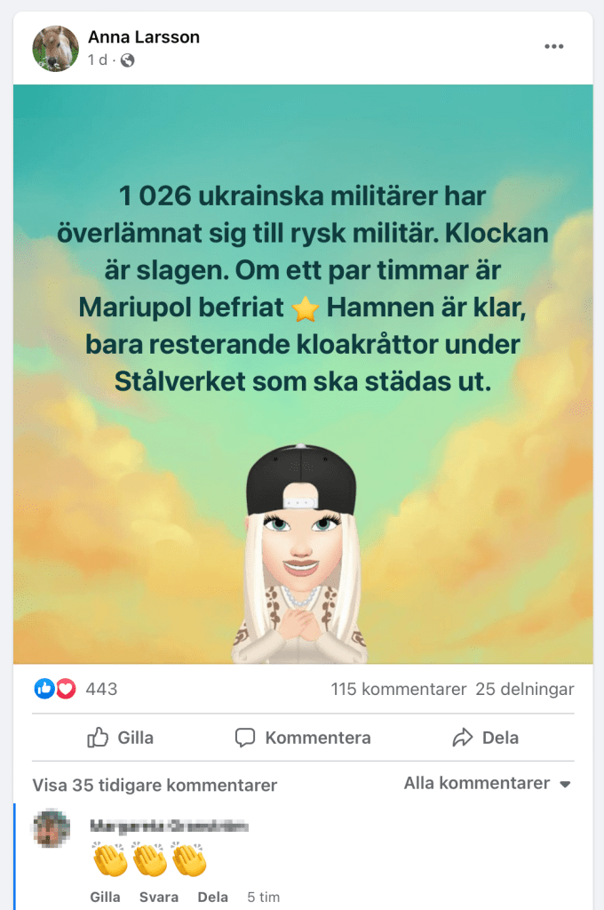 Det är inte bara det att användarna helt tycks ha köpt Rysslands narrativ, som att Ryssland har rätt att invadera Ukraina (eller är det fortfarande en »militär specialoperation«?) och att Ukraina styrs av nazister. Nej, det går längre än så.