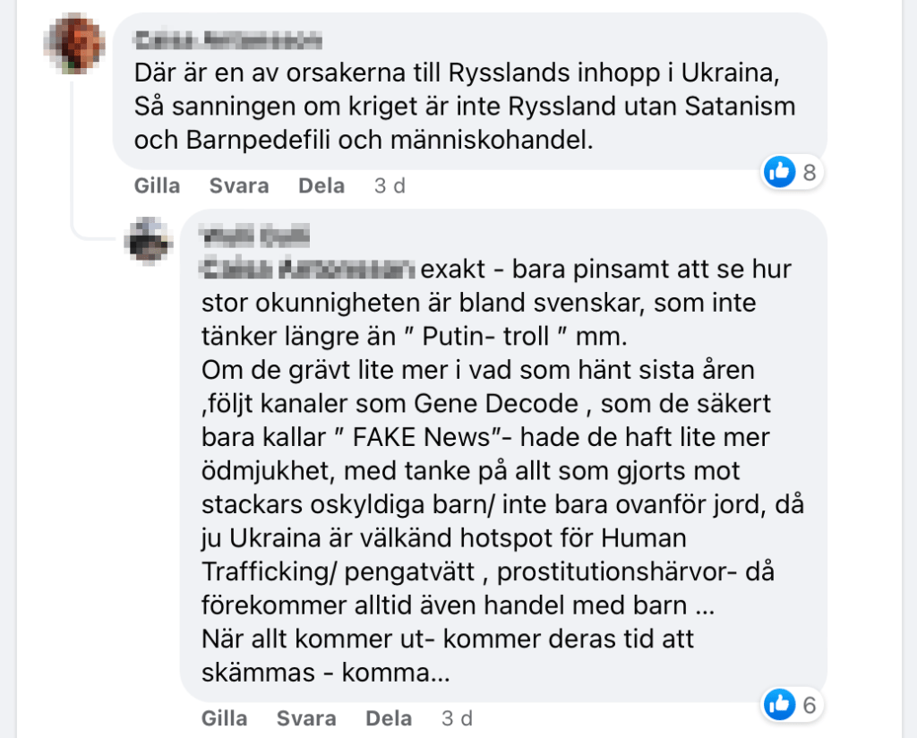 En annan sak som är aktuell nu i gruppen är förstås kriget mellan Ryssland och Ukraina. Ett krig som för övrigt kom »väldigt lägligt« direkt efter coronapandemin, enligt Folkdomstolens medlemmar. Lite för lägligt. Är det möjligen ett sätt för De Ondskefulla Styrande™ att fortsätta skrämma världens befolkning till underkastelse?