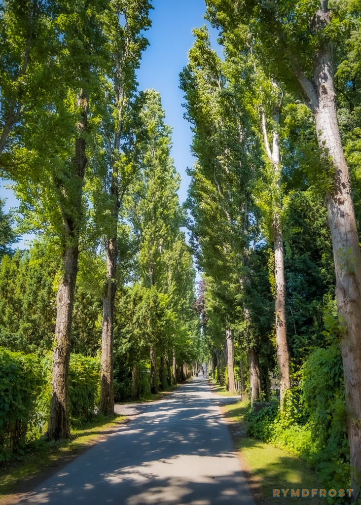 Tvärs igenom hela begravningsplatsen löper en snörrät väg kantad av poppel. Att vandra längs den känns som att gå i en naturens katedral, med träden sträckandes efter himmelen.