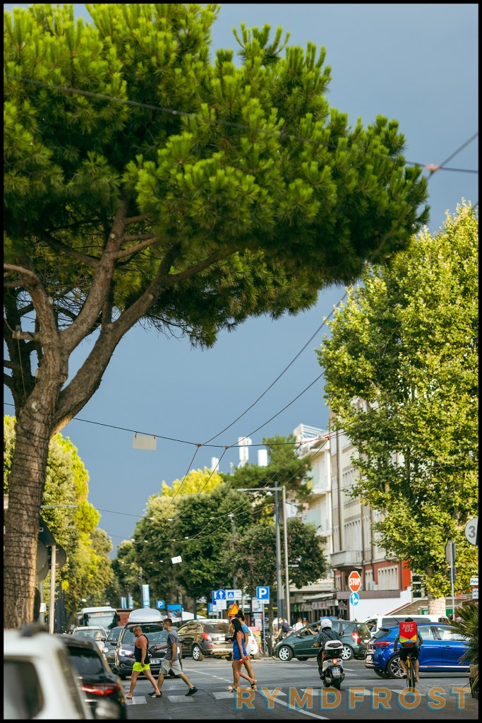 Rimini är även känt för att vara födelseorten för Federico Fellini, den store italienske filmregissören. (Ja, det var han som gjorde La Dolce Vita.) Här och var såg man tecken på det. Som att en park blivit uppkallad efter honom. Eller att en hel radda med gator har fått namn efter hans filmer. Måste vara lite speciellt att bo på en gata som (bokstavligen) heter 8½ (1963)… För övrigt en ganska skum film, om jag minns rätt.